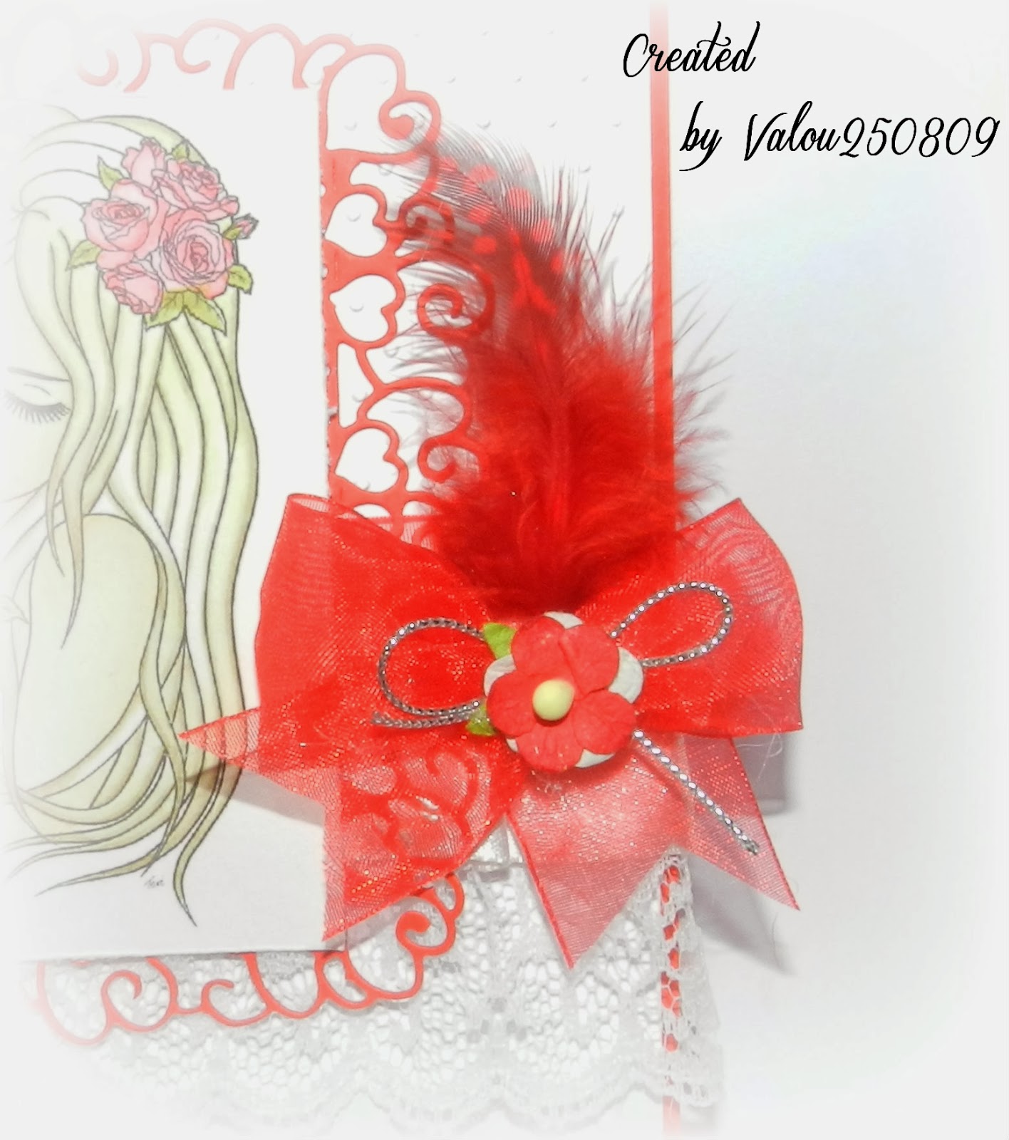 Sous l'image, j'ai collé de la dentelle blanche. Ensuite, j'ai collé un noeud que j'ai réalisé avec un morceau de ruban "Organza rouge" et je l'ai décoré d'une plume rouge et d'une fleur "Lilidaft" rouge.
